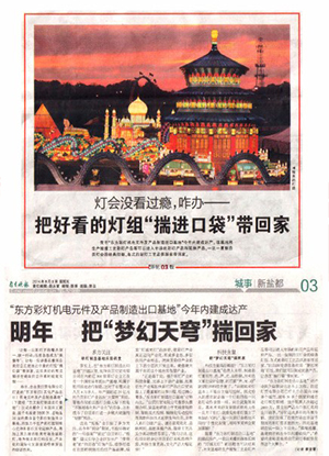 “東方彩燈制造出口基地”對(duì)產(chǎn)業(yè)的升級(jí)帶動(dòng)力還不止這些。自貢燈貿(mào)有限公司已經(jīng)先后在國內(nèi)200多個(gè)城市,國外30多個(gè)國家和城市進(jìn)行展覽展銷,境外觀展人次超過2000萬,其文化產(chǎn)品出口創(chuàng)匯名列全川前茅。“分析這么多年的外展外銷,我們發(fā)現(xiàn)了歐美市場在圣誕節(jié)期間的彩燈需求量巨大,因此基地將在這一塊上下功夫。”蔡翔透露,基地預(yù)計(jì)將在今年內(nèi)建成投產(chǎn),“希望將美輪美奐的自貢彩燈奉獻(xiàn)給世界這個(gè)大舞臺(tái)。”