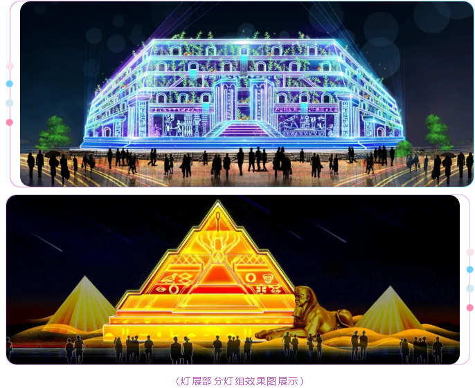 由自貢燈貿集團股份有限公司承制的“桔橙光影 大雅丹棱”燈光節,以“北緯30度,世界最神奇的存在”為主線,情景展開這一緯度上的奇觀絕景和神秘文化。精湛的彩燈工藝和現代光影技術,散發著異乎尋常和夢幻的光影色彩,為游人展示北緯30度各國的文化表情和最璀璨的古老文明。