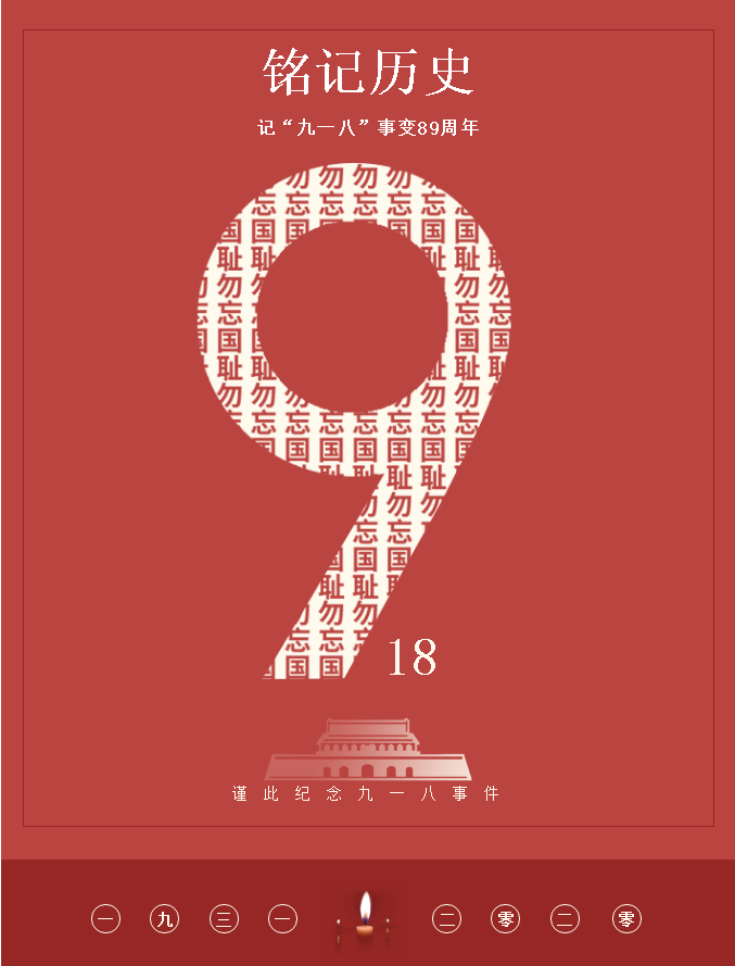 1931年9月18日,日本關東軍悍然炸毀南滿鐵路鐵軌,炮轟北大營、攻占沈陽城,制造了震驚中外的“九一八”事變。自此,中華民族開啟長達14年的浴血奮戰。大半個中國被踐踏,3500多萬同胞傷亡,多少東北兒女,毀家紓難,以血肉之軀筑起了新的長城。一寸山河一寸血,不忘曾經烽煙起,心中長鳴警鐘聲,銘記九一八,勿忘國恥,吾輩當自強。