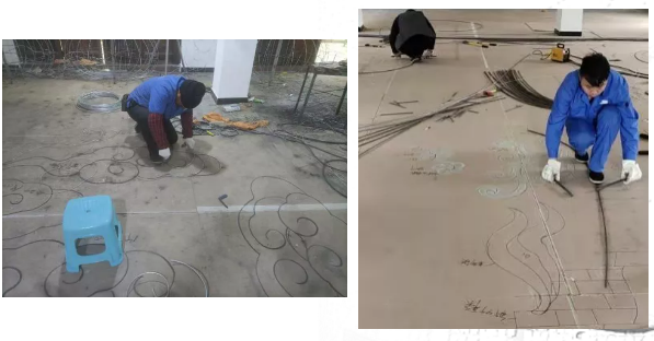 看,來自東方彩燈的工匠們正在放樣、造型,按照效果圖,在地面上描一幅放大的勾線圖,然后將一根根鐵絲用鉗子扭成一段段彎曲的線條,把平面圖變成一幅由實體材料組成的框架。