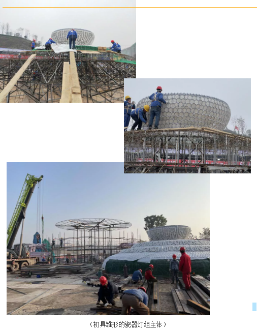 燈貿集團執行總裁陶建軍介紹:“《巴蜀一家親》主燈組體量龐大,長22米,高28米。材質為瓷器,該燈組最大的特色是瓷器內光源的一個創新,景德鎮“玲瓏碗”,4+7光色的變化,晶瑩剔透,美輪美奐”