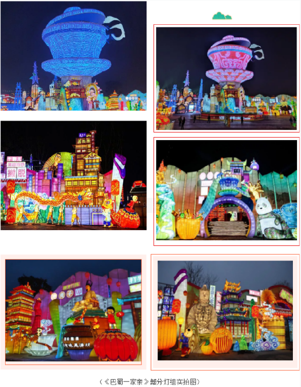 今年,自貢·中華彩燈大世界以“觀自貢燈 過中國年”為主題,550畝展區、十五大主題、上百組彩燈,給游客們帶來一場自貢彩燈文創新紀元的視覺盛宴。有800多年歷史的自貢燈會,開啟全新云時代,將自貢燈會打造成展現時代風貌的大舞臺,讓您足不出戶也能領略“天下第一燈”的魅力!由燈貿集團創意、設計團隊等數百名彩燈匠人歷時兩個多月精心打造的《巴蜀一家親》、《自貢記憶》、《五糧液》三個大型燈組。《巴蜀一家親》薈萃川渝各城風貌之靈光,主體以獨具特色的川渝茶文化代表——蓋碗茶為載體,現代透光材質制作憨態可掬的熊貓,下方高鐵環繞而行,輔以巴蜀特色元素,將自貢傳統彩燈制作工藝與新技術相結合,為游客帶來可看、可聽、可聞的沉浸式的觀燈體驗。