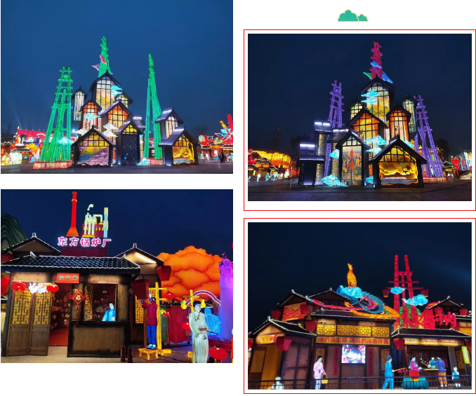 《自貢記憶》主燈組使用傳統材質結合現代工藝,宏偉的天車獨創性的使用啤酒瓶制作,配合追光變色形成絢麗奪目的燈光效果。顯示屏剪影式表現自貢元素??铸埓┬小㈠\鯉游動,還有靈活靈現的自貢歷史場景和人物,還原了一幅原滋原味又生動的老自貢記憶。