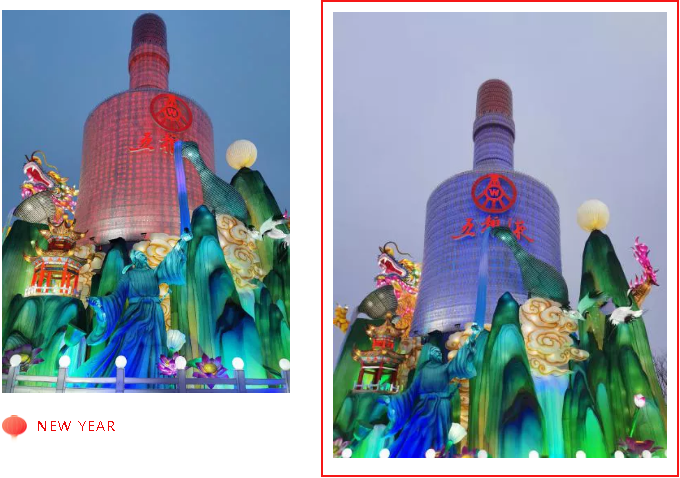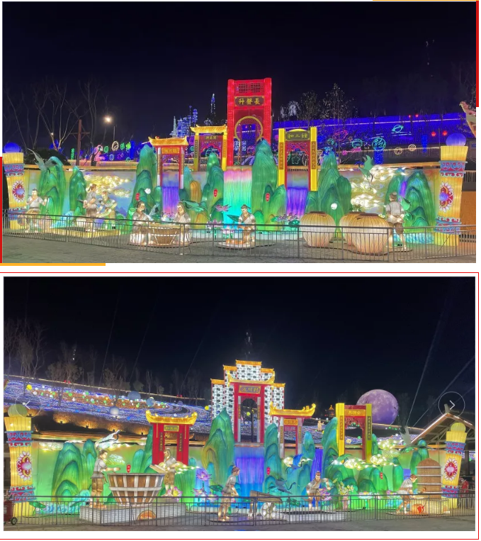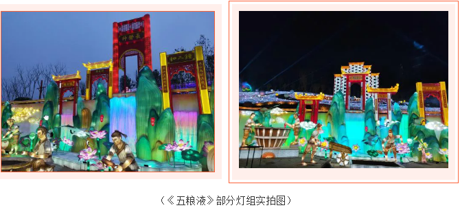 《五糧液》主燈組采用第八代五糧液酒瓶運用自貢彩燈傳統工藝捆扎而成巨型五糧液,輔以仙山、仙境、巨龍騰越氛圍闡釋五糧傳奇,杯酒時光,百年味道。周邊群燈組展示封存在時光中的“活窖池”--利川永、張萬和、劉鼎興、天賜福、聽月樓、全恒昌等八家明代釀酒作坊,歷史悠久的古窖池群講述著傳承幾百年的五糧液釀酒工藝,折射幾千年氤氳酒香的中國酒歷史和酒文化。