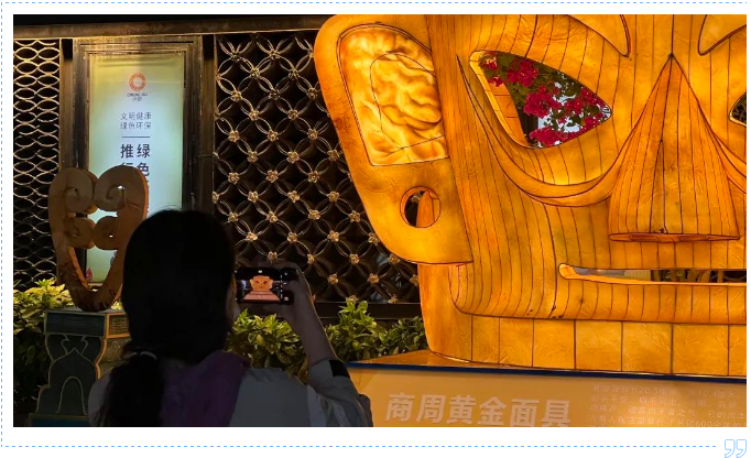 高仿真復(fù)原的古蜀文物造型燈組制作精美。在文物原件基礎(chǔ)上放大40倍制作而成的黃金面具燈組呈現(xiàn)出王者之氣的風(fēng)范,青銅立人、小金面具、喇叭形金器等6件文物造型燈組環(huán)伺左右,立體呈現(xiàn)古蜀先民的高超智慧。